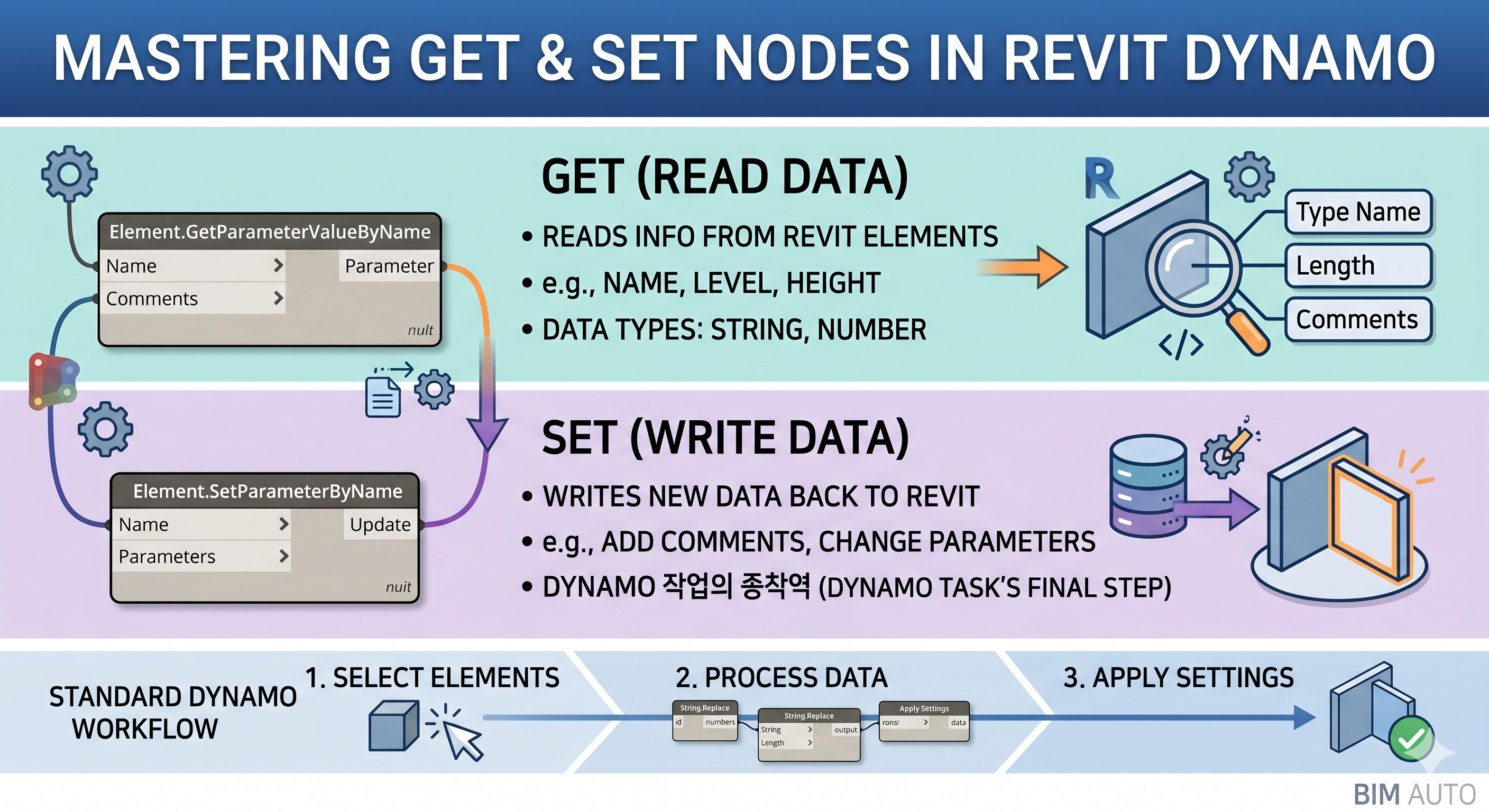 💡 BIM 전문가 Kai의 한마디 다이나모는 결국 **"어떤 데이터를 가져와서(Get), 어떻게 주무른 뒤, 어디에 넣을 것인가(Set)"**의 싸움입니다. 이 흐름만 이해해도 실무 자동화의 80%는 완성된 것이나 다름없습니다.