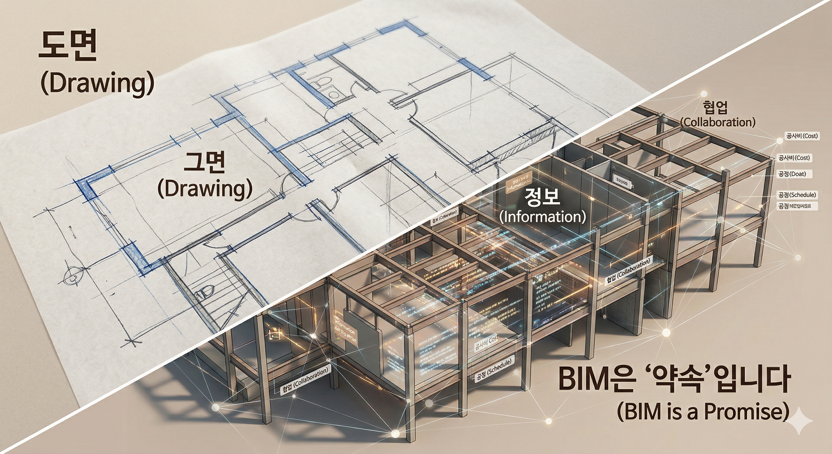 3. 툴의 한계일까요, 우리 사고의 한계일까요? 50대인 저도 매일 툴과 씨름합니다. 그런데 깨달은 게 하나 있어요. 툴이 내 감각을 못 따라오는 게 아니라, 내 설계가 '데이터'로서의 가치를 아직 못 갖춘 건 아닐까 하는 의구심입니다. 우리가 여전히 2D 기반의 '선과 면'으로만 사고하고 있다면, 어떤 신기술이 와도 불편할 수밖에 없습니다.